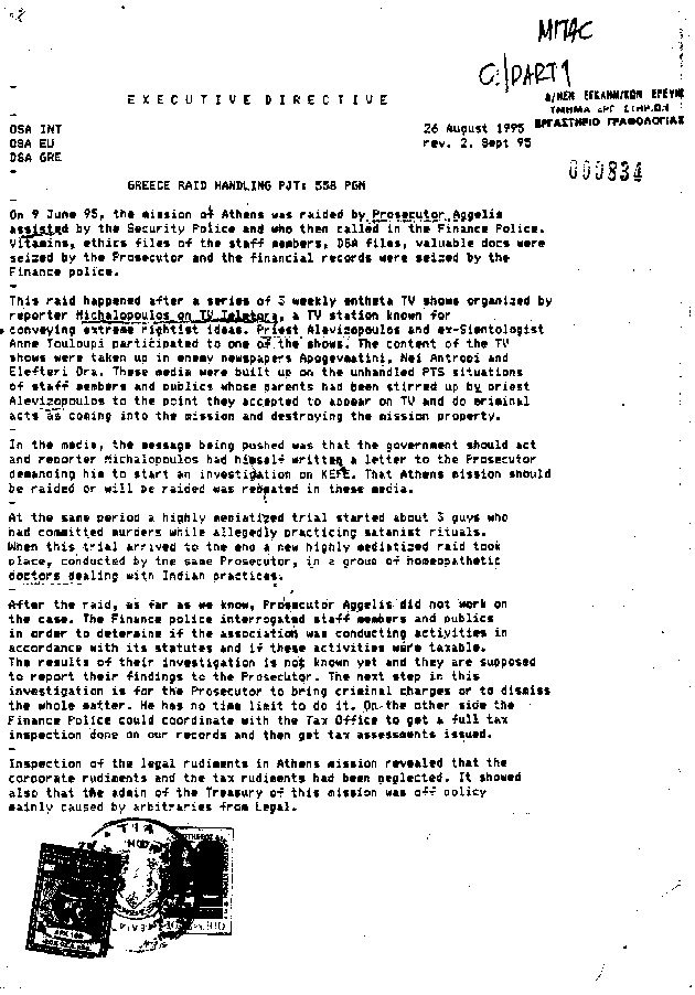 The Greek branch of Scientology, KEFE (Greek Center for Applied Philosophy), was raided by the authorities on 9 June 1995. In response, the Office of Special Affairs drew up a "handling project" to eliminate the threat to Greek Scientology. The following pages present the documents themselves and a page-by-page analysis.