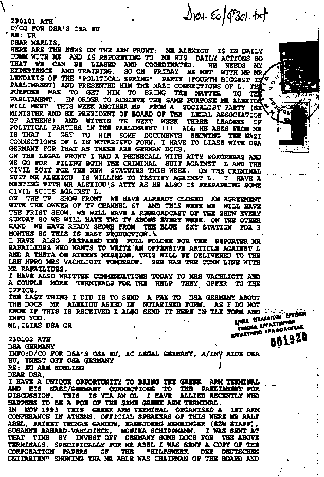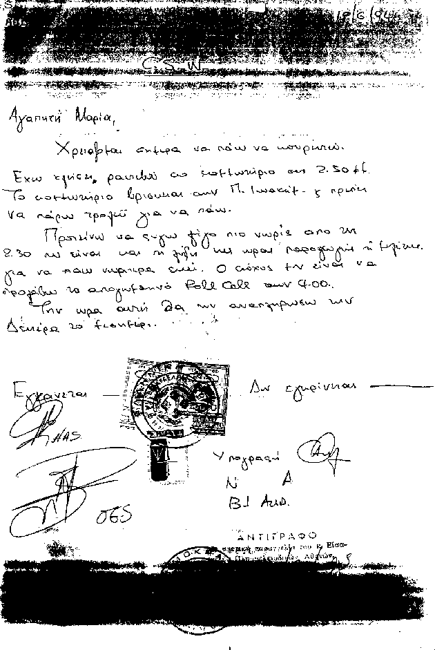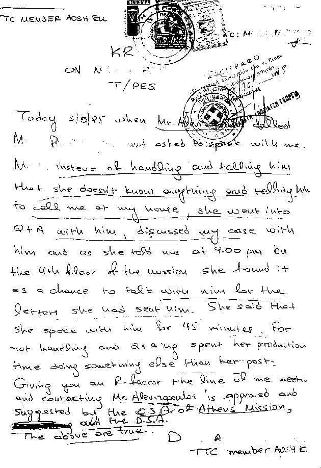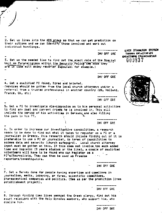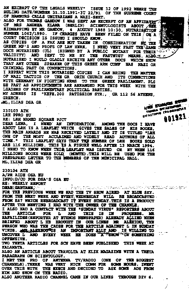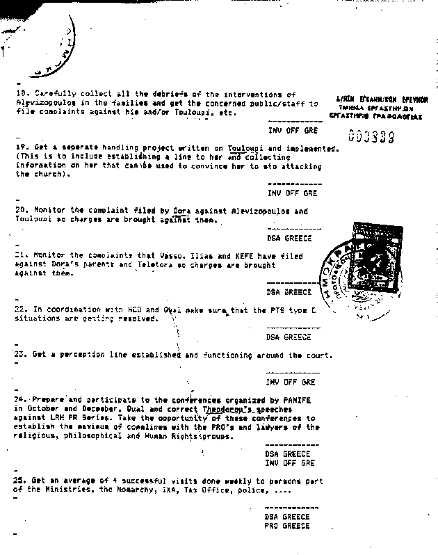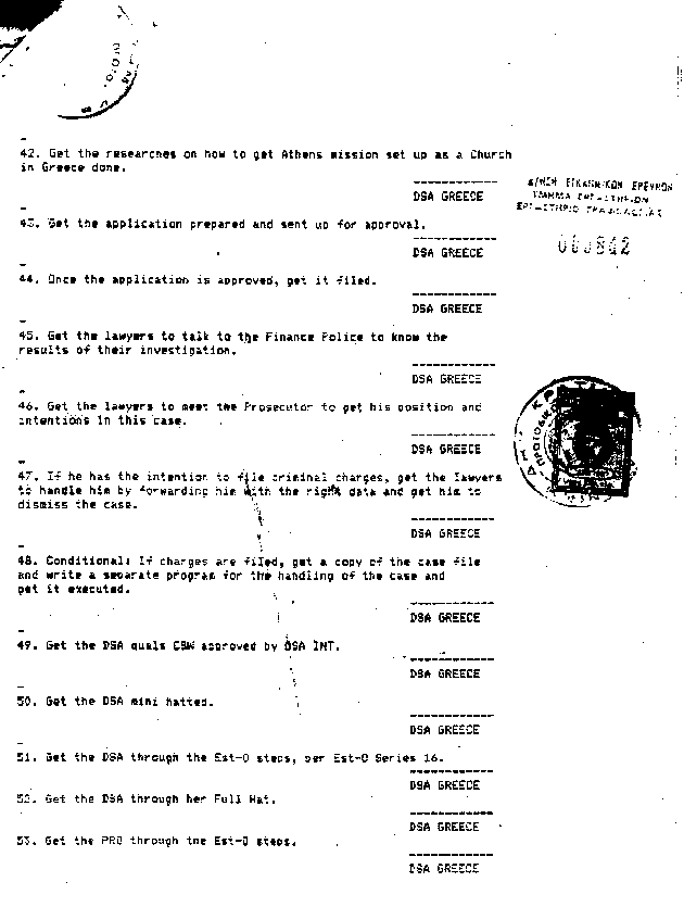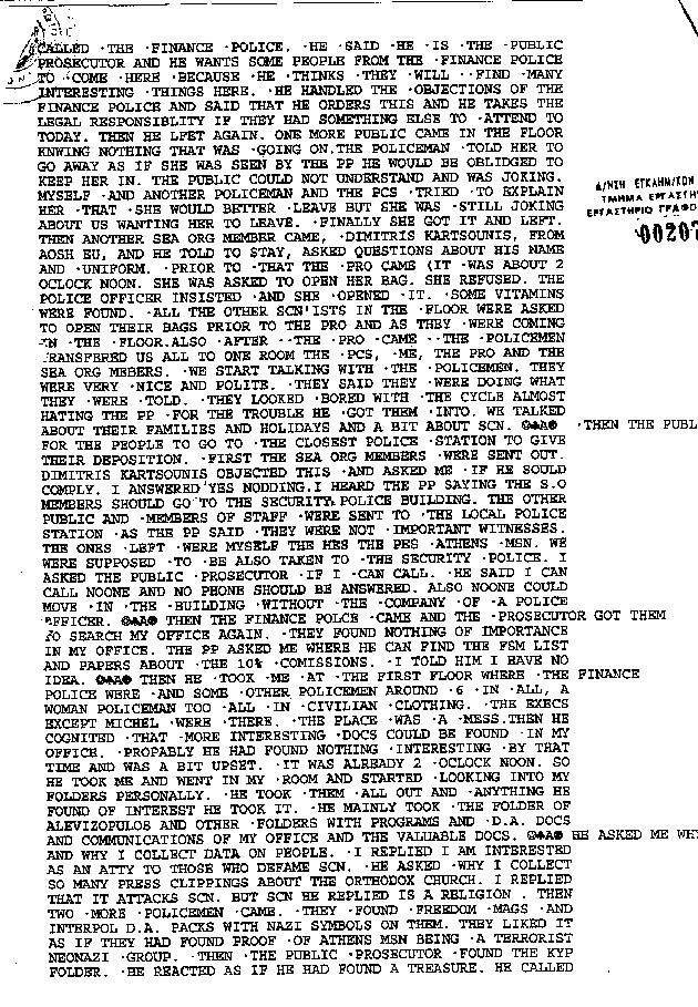 Documents seized from The Church of Scientology in Greece when police raided them. Later the "church" was by a judge thrown out of Greece!